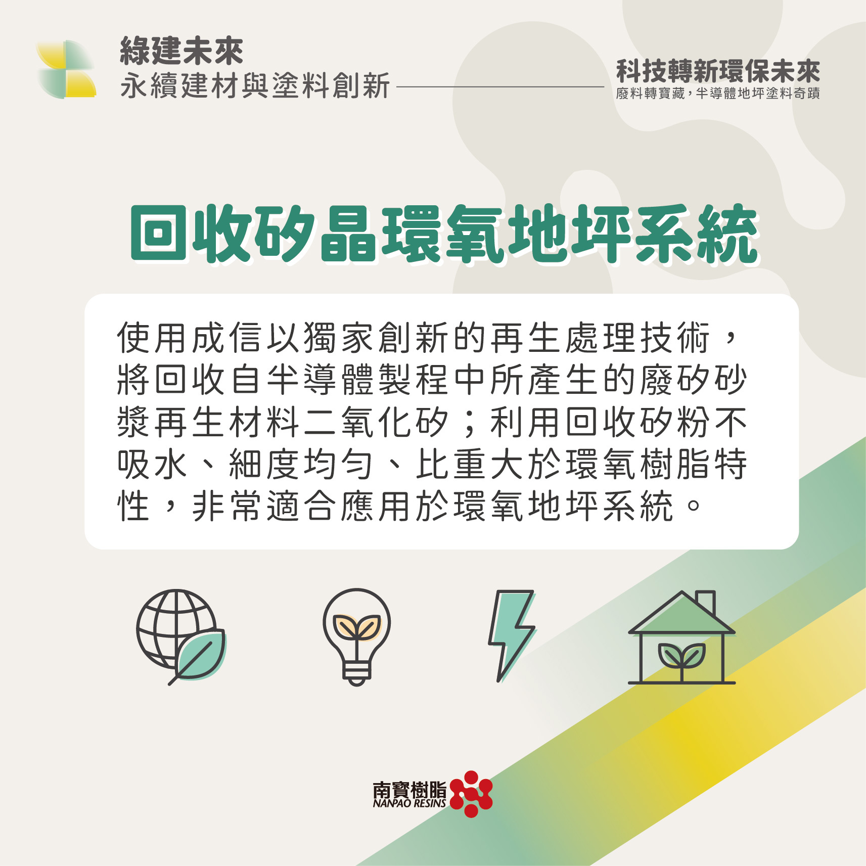 使用成信獨家再生處理技術,將半導體製程中廢棄的矽砂漿回收為再生材料二氧化矽。回收的矽粉不吸水、細度均勻、比重大於環氧樹脂的特性,非常適合用於環氧地坪系統。