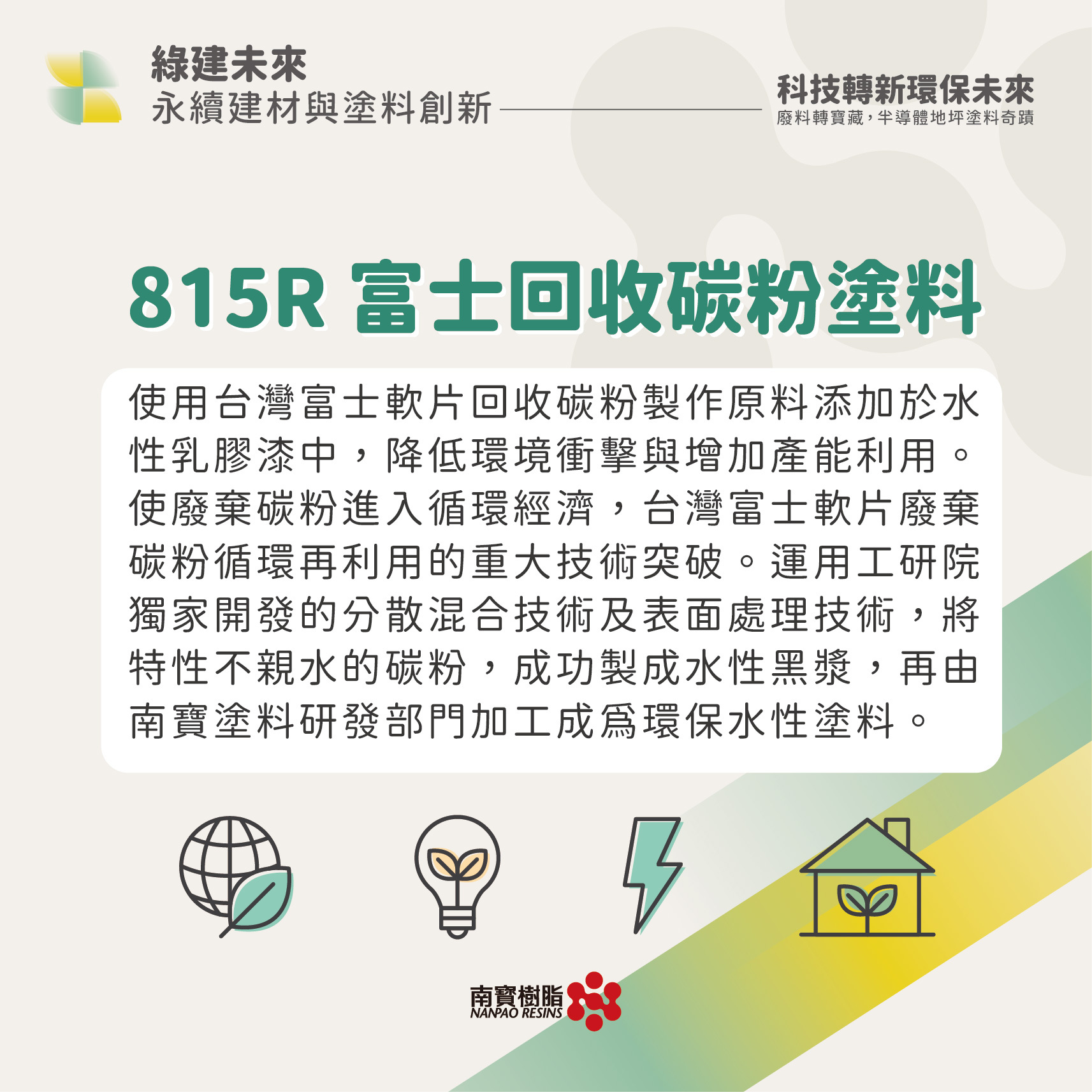 利用台灣富士軟片回收碳粉,添加至水性乳膠漆中;採工研院獨家開發的分散混合技術及表面處理技術,成功轉化特性不親水的碳粉為水性黑漿,由南寶塗料研發部門加工成為環保水性塗料。
