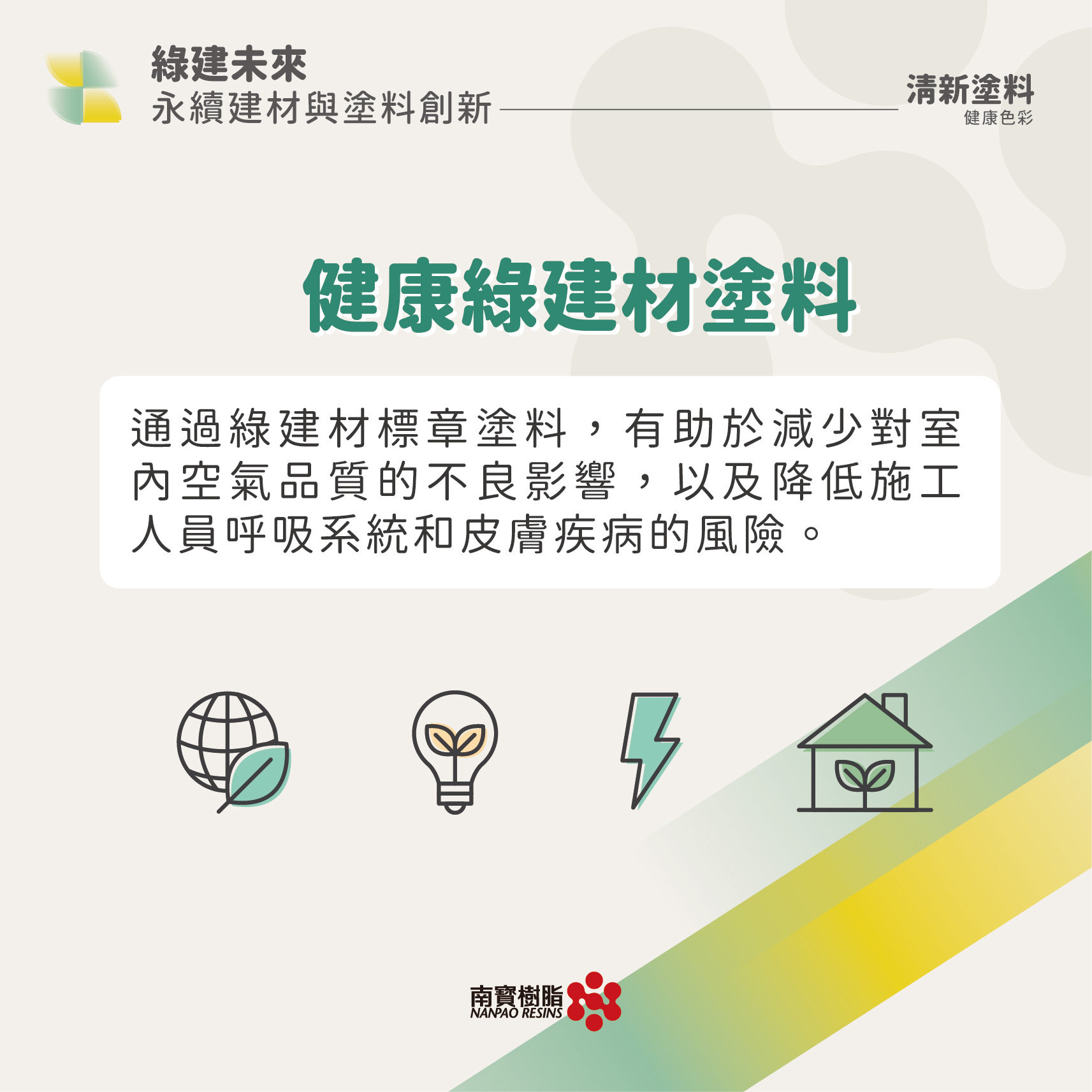 通過綠建材標章塗料,減少不良的室內空氣品質,降低施工人員呼吸系統和皮膚疾病的風險。